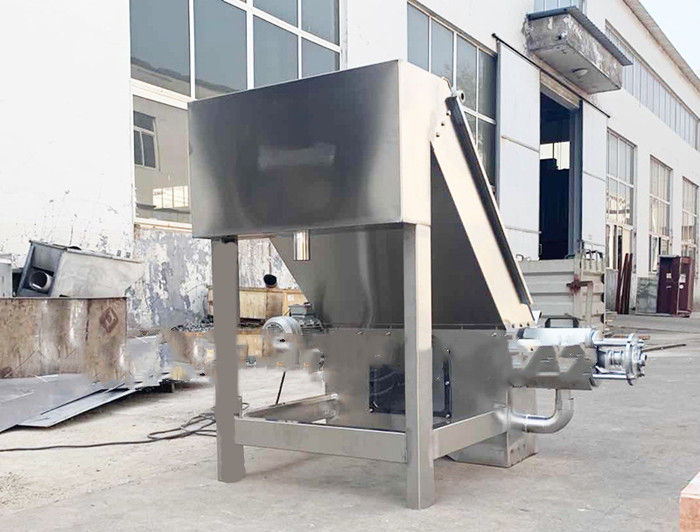 污泥通過泵,輸送至污泥槽,流至混合槽內(nèi),同時(shí)絮凝劑由加藥泵送至槽內(nèi),混合槽由液位控制,防止?jié)M溢。攪拌混合形成泛花,理想泛花象棉花狀,一朵朵的,然后流至過濾機(jī),液體透過動(dòng)片與定片的間隙流出,固體通過螺旋旋轉(zhuǎn)不斷向前,在出口壓板的作用下充分脫水,至出口。